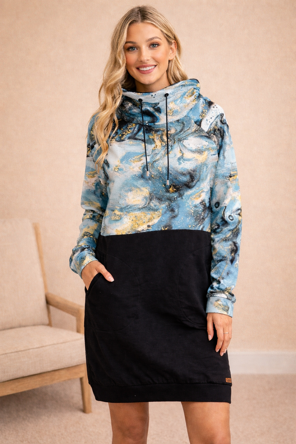 Moderní design doplňuje jemný puntíkovaný vzor, praktické kapsy s černým vnitřkem a pohodlný stojáček s tunýlkem. Tyto mikinošaty s kapsami snadno zkombinujete s legínami, silonkami i teniskami nebo kotníkovými botami.