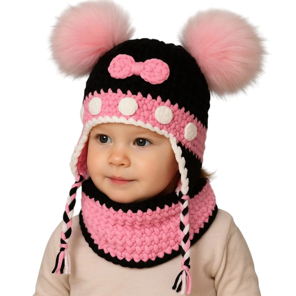 Háčkovaná ušanka MINIE s dvěma bambulema a nákrčníkemDo týdne 5 ks770 Kč/ ks